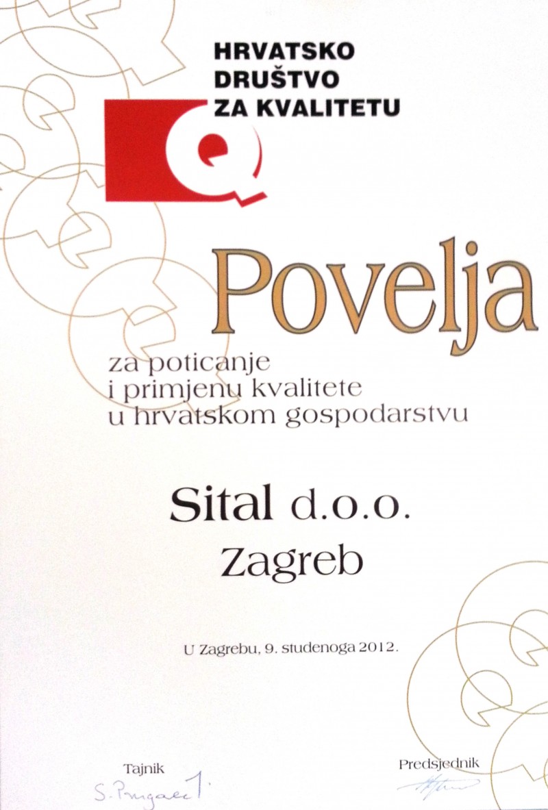 On 9 November 2012, the Croatian Society for Quality awarded SITAL Ltd. with a Charter for the promotion and application of quality in the Croatian economy for small businesses.